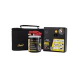 V balení sa nachádza výkonný kompresor, ktorý dokáže rýchlo nafúknuť vašu pneumatiku. Fľaša s objemom 450 ml so špeciálnou tesniacou hmotou bude stačiť na opravu klasickej pneumatiky. Opravná sada je schopná utesniť defekt do 6 mm. Navyše táto tesniaca hmota nepoškodzuje TPMS senzor (čidlo tlaku pneumatík).