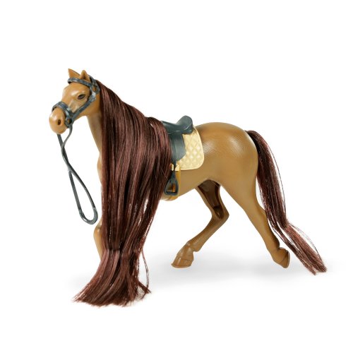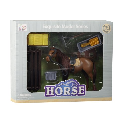 Kôň s tmavou hrivou a sedlom. Kone môžeš česať, a to napríklad kefou, ktorú nájdeš v balení. Veľkosť koňa 14 cm. Súčasťou je skladacia ohrada a príslušenstvo. Vyrobené z PVC.