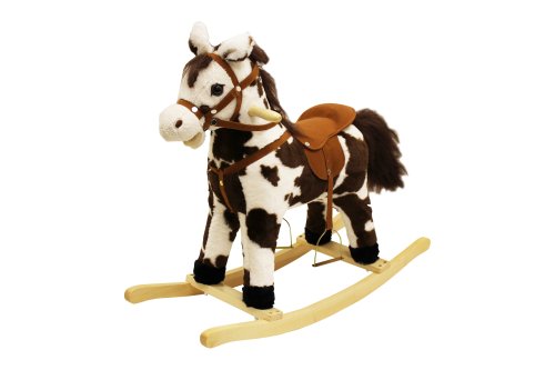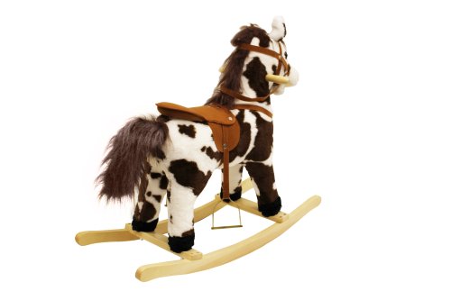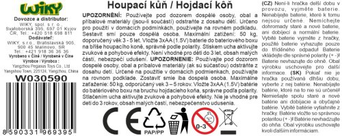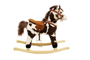 Kôň hojdací s efektmi strakatý. Rozmery 71x30x62 cm. Vydáva zvukové efekty, hýbe papuľou a chvostom. Aktivácia tlačidlom v uchu. Priehradka na batérie sa nachádza na bruchu koňa. 3xAA batérie nie sú súčasťou.