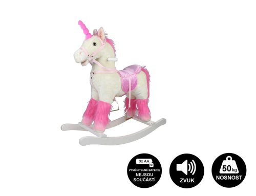 Kôň hojdacia biely jednorožec plyš na batérie 71cm so zvukom a pohybom nosnosť 50kg v krab.