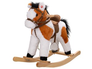 hnedobielu farbu sedlo so strmeňmi po stranách drevené držadlá zvukové efekty (rechtanie, zvuky cvalu) nosnosť max. 50 kg Rozmery: