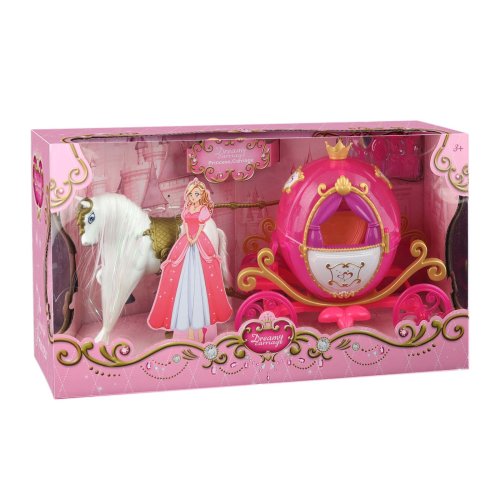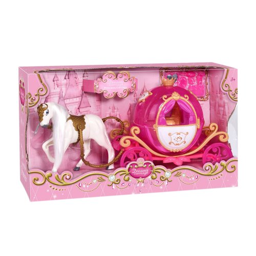 Biely kôň s dlhou hrivou zapriahnutý do ružového rozprávkového kočiara. Každá bábika si bude priať vyraziť v ňom na zámocký bál! , hrá hudba a bliká. Batérie sú súčasťou výrobku.