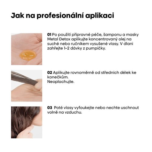 Kovové častice prenikajú do vlasového vlákna pri každom umývaní vlasov a zvyšujú riziko lámavosti vlasov či nespoľahlivých farebných výsledkov. Koncentrovaný olej obohatený o glicoamine chráni vlasy pred usadzovaním kovových častíc. Vlasy sú okamžite vyživené a pevnejšie. Po prvom použití je riziko lámania vlasov nižšie o 97% a vlasy sú 2x viac vyživené, získajú väčší objem a disciplínu. Chráni vlasy proti krepovateniu a poskytuje ochrana vlasov pred tepelným stylingom až do 230 °C. Je vhodný pre všetky textúry vlasov.