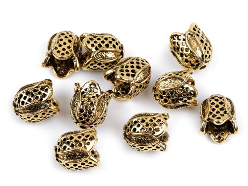 Kovový kvaplík v tvare kvetu môžete využiť ako zaujímavý a oživujúci prvok v širokej škále výrobkov. Je vhodný ako koncovka na odevné šnúrky. Má skvelé využitie ako sukienka na výrobu malých bižutérnych anjelov. Prievlak horný 2 mm, spodný 7,5 mm, výška 12 mm.