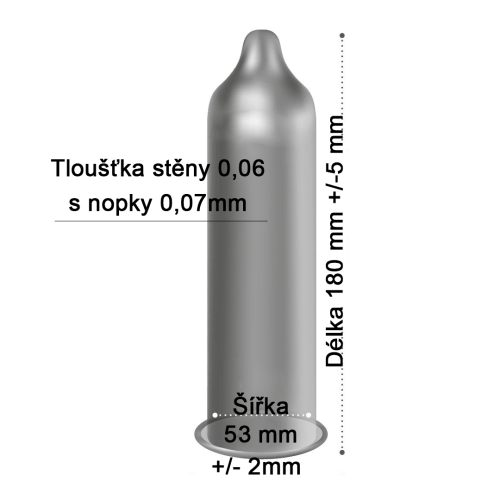 Rozmery: celková dĺžka kondómu: 18 cm nominálna šírka kondómu: 5,3 cm hrúbka steny: 0,06 až 0,07mm
