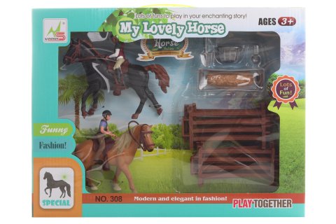 Súprava koníkov s doplnkami. Balenie obsahuje 2 kone, 2 jazdcov, ohradu a ďalšie doplnky. Rozmery balenia cca 37 x 28,5 x 5,5 cm. Vek 3+