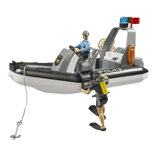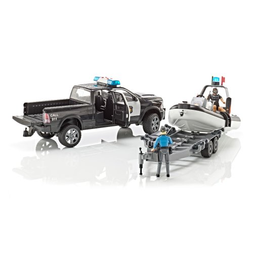 Policajné vozidlo RAM Bruder 02507 vychádza zo známeho modelu RAM 2500 a má na streche namontovaný svetelný a zvukový modul. Hračka je rovnako ako jej skutočný vzor vybavená štvordverovou kabínou s otváracími dverami prispôsobenou pre figúrky BWORLD. Auto má odpružené nápravy a prednú riaditeľnú nápravu aj predĺženým volantom, ktorý je súčasťou balenia. Korba má otváracie zadné čelo. Žiadnemu policajnému vozidlu nemôže chýbať maják a nechýba ani modelu Bruder 2507. Nevyhnutným pomocníkom pre políciu v Bruder svete je čln s policajným potápačom a dôležitým vybavením aj majákom. Na člne je možné viezť až 3 figúrky BWORLD. Čln je prispôsobený na plávanie vo vani alebo napr . vo vašom bazéne. Súčasťou balenia modelu Bruder 2507 sú tiež 2 figúrky, figúrka policajtky a potápača . Hlavné vlastnosti: Balenie obsahuje policajné auto RAM, príves, čln s príslušenstvom a 2 figúrky (1x policajtka a 1x potápač) Mierka: 1:16Rozmery auta: 40x17x15 cmRozmery prívesu: 38,5x16,2x6,2 cmRozmery člna: 27x12x9 cmVeľkosť figúrky: cca 10,6 cm 4 rokov