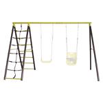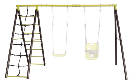 Vďaka kovovým okám na ňu ľahko zavesíte hojdačky alebo hojdačky pre batoľatá či hojdací kruh . Medzi dvoma bočnými vzperami je rebrík a lezecká sieť z PE plastu, tretí pár vzpier je pripravený na pripevnenie šmykľavky . Z bezpečnostných dôvodov musí byť konštrukcia záhradnej hojdačky ukotvená k zemi. V balení preto nájdete aj kotviace háky a návod na správne a bezpečné ukotvenie.