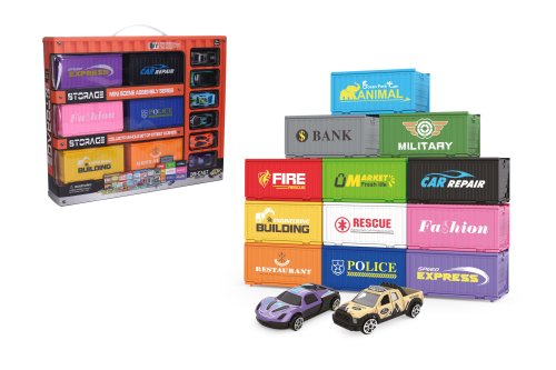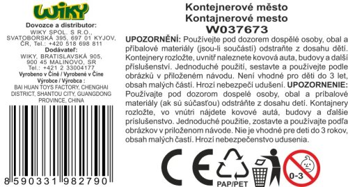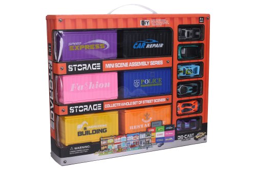 Kontajnerové mesto - 6 kontajnerov. Veľkosť kontajnera 12,5 cm, autá 7 cm. Obsahuje 6 kontajnerov, 6 kovových áut s voľnými kolesami. Každý kontajner obsahuje 1 kovové auto, 2 budovy, 2 pouličné lampy, semafor, ulicu, 2 figúrky, polepy, obrázkový návod na zostavenie.