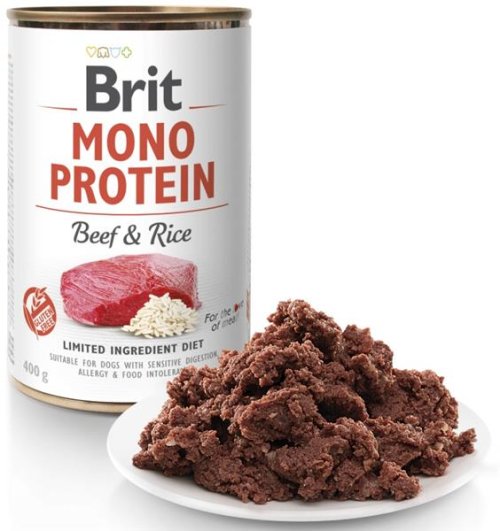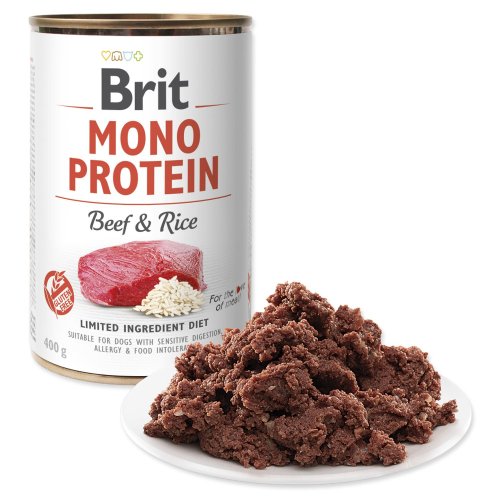 Monoproteín – konzerva obsahuje iba mäso a vnútornosti z jedného živočíšneho zdroja. Nájdenie toho, čo škodí psom s citlivým zažívaním, intoleranciou alebo s alergiou, môže byť beh na dlhú trať, v ktorom nám môžu pomôcť konzervy s jedným druhom proteínu. Vylučovacou metódou je možné ľahko vyradiť všetko škodlivé. Pretože niektorí psi s citlivým zažívaním zle trávia väčšie kúsky mäsa či vnútorností, majú konzervy Brit Monoproteín konzistenciu jemného paté – lepšie sa trávia a ľahko ich prijímajú aj psí seniori, ktorí majú problém so zubami. Hlavné prednosti: