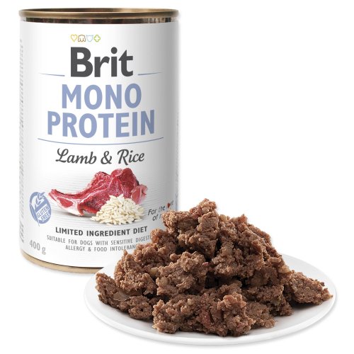 Monoproteín – konzerva obsahuje iba mäso a vnútornosti z jedného živočíšneho zdroja. Nájdenie toho, čo škodí psom s citlivým zažívaním, intoleranciou alebo s alergiou, môže byť beh na dlhú trať, v ktorom nám môžu pomôcť konzervy s jedným druhom proteínu. Vylučovacou metódou je možné ľahko vyradiť všetko škodlivé. Pretože niektorí psi s citlivým zažívaním zle trávia väčšie kúsky mäsa či vnútorností, majú konzervy Brit Monoproteín konzistenciu jemného paté – lepšie sa trávia a ľahko ich prijímajú aj psí seniori, ktorí majú problém so zubami. Hlavné prednosti: