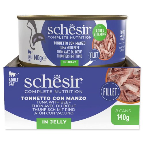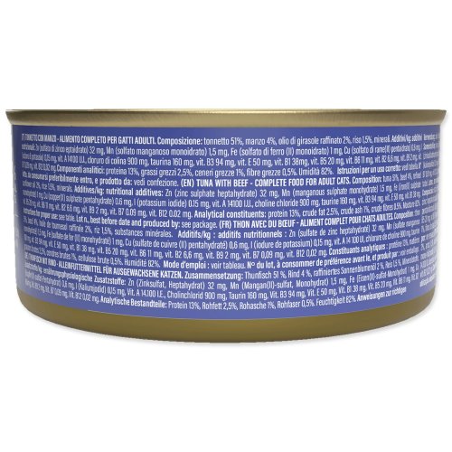 Konzerva s mäsom z tuniaka a hovädzími filetami. Doplnkové krmivo pre dospelé mačky.
