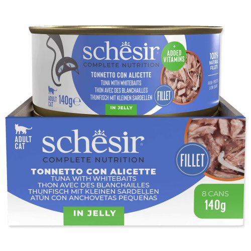 Konzerva s mäsom z tuniaka so sleďom v želé. Doplnkové krmivo pre dospelé mačky.