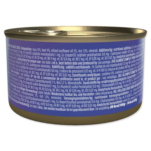 | Zloženie | Tuniak 51%, hovädzie filetky 4%, ryža 1,5%, rafinovaný slnečnicový olej 2%, minerály. |