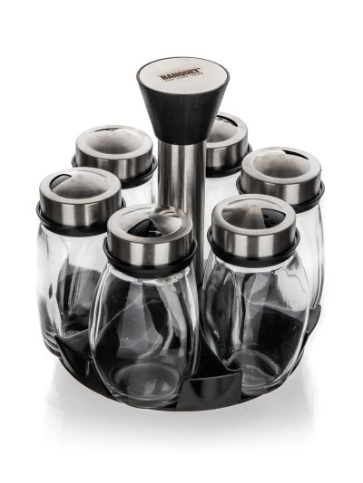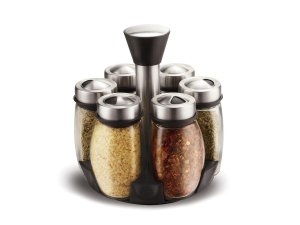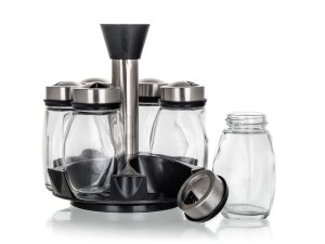 Sada sklenených koreničiek BARRIL v otočnom stojane. Koreničky majú všestranné využitie a to na základe viečka, ktoré je opatrené 3 rôznymi otvormi - jemný, hrubý, univerzálny. Koreničky sú vhodné na jemne mleté, ale aj hrubšie druhy korenia a rovnako tak sú ideálne pre korenie typu klinčekov a celé korenie. Do umývačky je možné dať iba sklenená časť koreničiek.