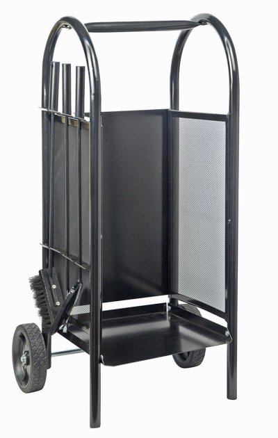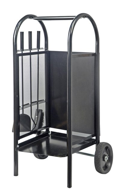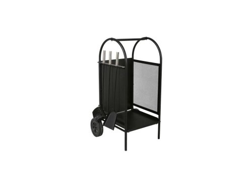 Krbové náradie s vozíkom na drevo, ktorý je praktickým pomocníkom na prenos a uskladnenie dreva pri krbe.