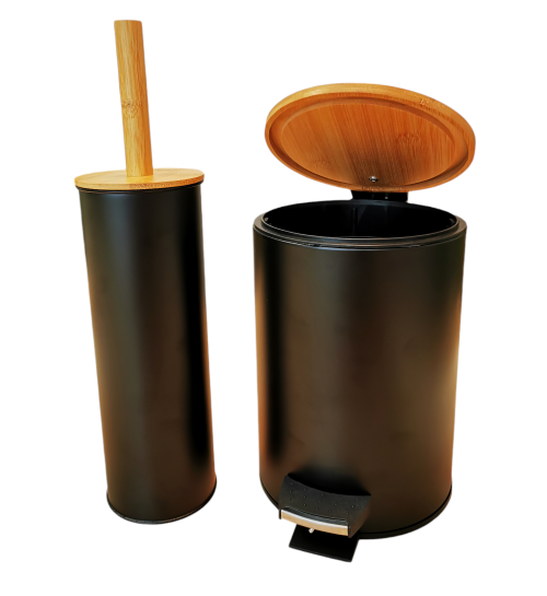 Odpadkový kôš je vhodný nielen do kúpeľne, ale aj do ostatných miestností Vašej domácnosti. Kôš má vyberateľnú nádobu, vďaka ktorej sa ľahko udržuje a jednoducho sa s ním manipuluje. Odpadkový kôš s objemom 3 lv čiernom matnom prevedení a bamusovým vekom s tlmeným zatváraním SOFT CLOSE. V sete s kefou na toaletu. Rozmer výrobku 17x17x22,5 cm kôš; 9,5x9,5x38cm kefa. Balené v PE vreci a krabici.