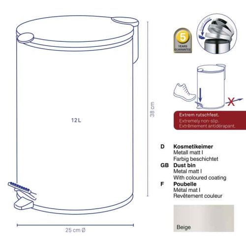 Pedálový kôš KELA Mats 12 l v matnej bielej farbe je univerzálnym pomocníkom do kúpeľne aj kuchyne. Matná kovová povrchová úprava pôsobí moderne, je odolná a ľahko sa čistí. Rad Mats spája elegantný vzhľad s praktickými funkciami, ktoré uľahčujú každodenné používanie.