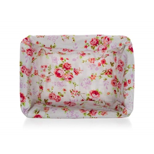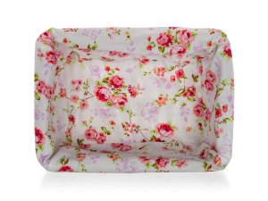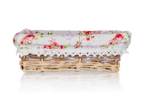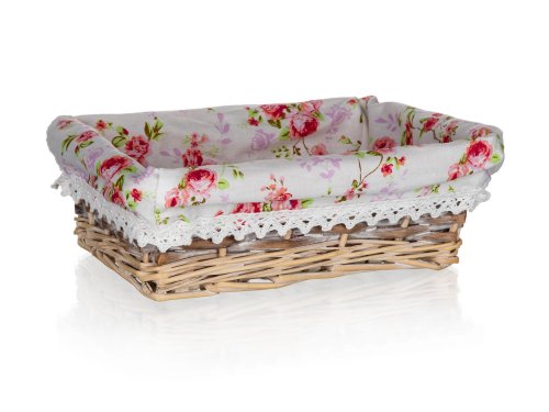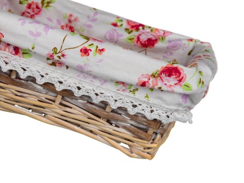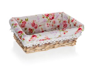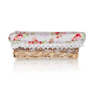 Prútený košík ROSES je vhodný iba na dekoratívne účely. Dodávaný v hnedobielej farbe obdĺžnikového tvaru, vo vnútri bavlnená látka s motívom ruží a krajkovým lemom.