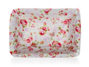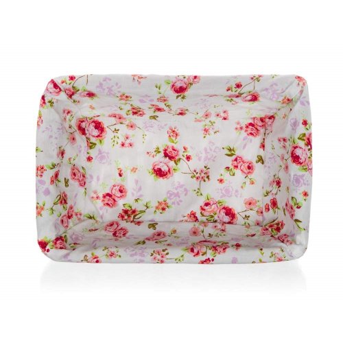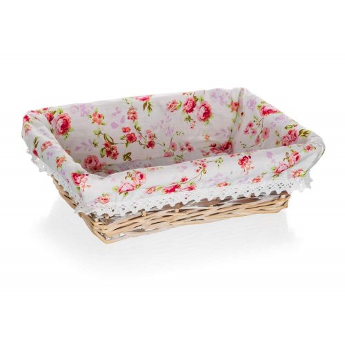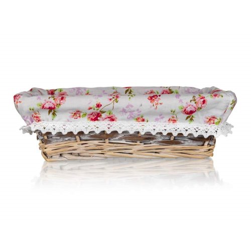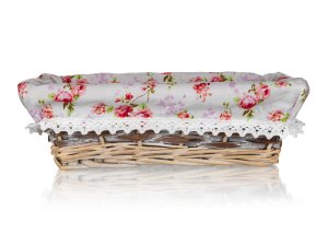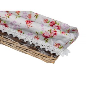 Prútený košík ROSES je vhodný iba na dekoratívne účely. Dodávaný v hnedobielej farbe obdĺžnikového tvaru, vo vnútri bavlnená látka s motívom ruží a krajkovým lemom.