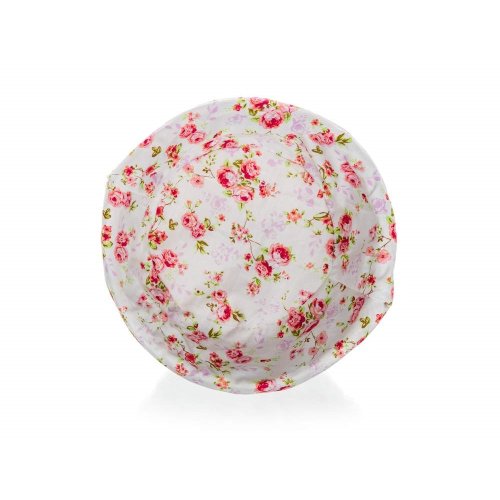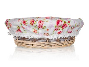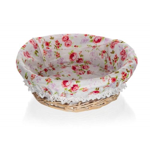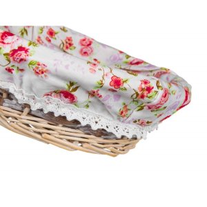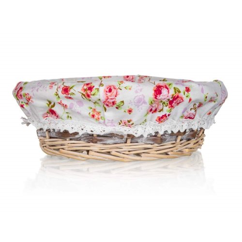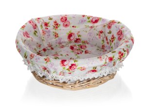 Prútený košík ROSES je vhodný iba na dekoratívne účely. Dodávaný v hnedobielej farbe okrúhleho tvaru, vo vnútri bavlnená látka s dekorom ruží a krajkovým lemom.