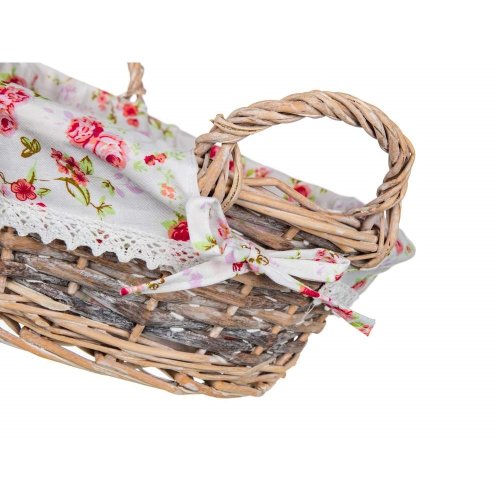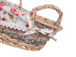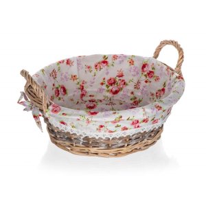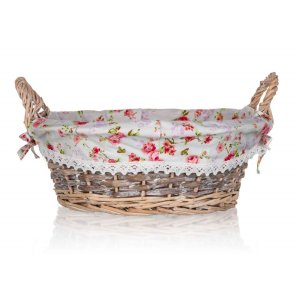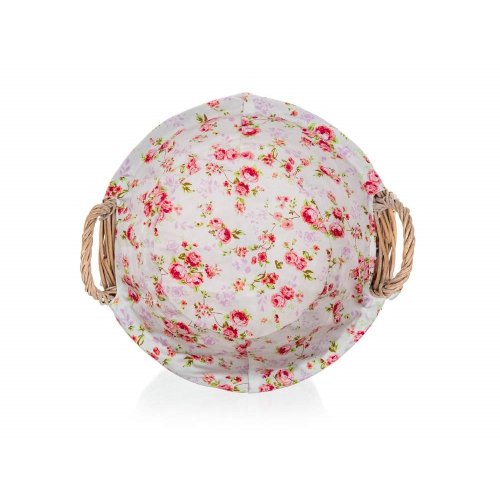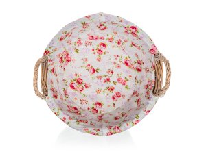 Prútený košík ROSES s uchami je vhodný iba na dekoratívne účely. Dodávaný v hnedobielej farbe okrúhleho tvaru, vo vnútri bavlnená látka s dekorom ruží a krajkovým lemom.