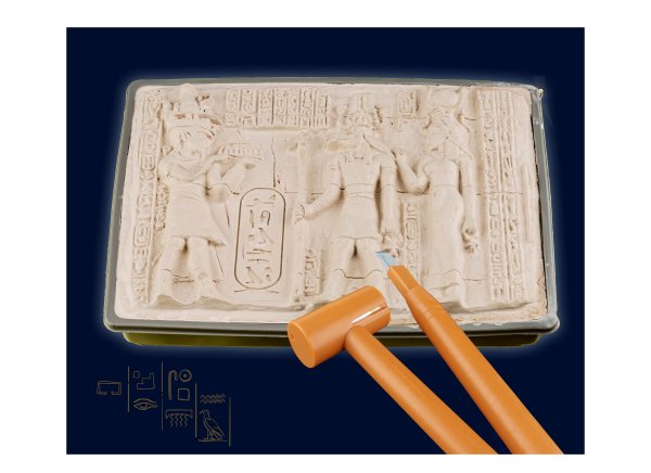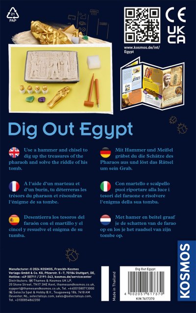 KOSMOS Egyptské vykopávky. Odporúčaný vek 7-11 rokov. Obsahuje majzlík a kladivko na odkrytie vykopávok v sadre. Slovenský návod na stiahnutie v digitálnej podobe-QR kód na krabici av návode.