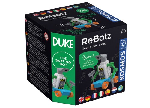 KOSMOS Robot Duke jazdiaci, 3xAAA nie sú súčasťou. Obsahuje dieliky na zloženie robota, nálepky. Odporúčaný vek 8-12 rokov. Slovenský návod na stiahnutie v digitálnej podobe-QR kód na krabici av návode.