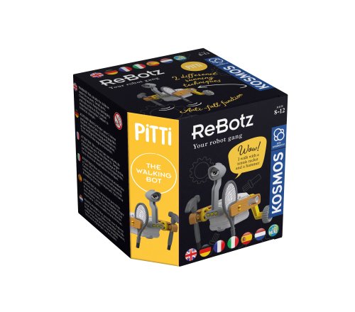 KOSMOS Robot Pitti chodiaci. 3xAAA batérie nie sú súčasťou. Obsahuje dieliky na zloženie robota, nálepky. Odporúčaný vek 8-12 rokov. Slovenský návod na stiahnutie v digitálnej podobe-QR kód na krabici av návode.