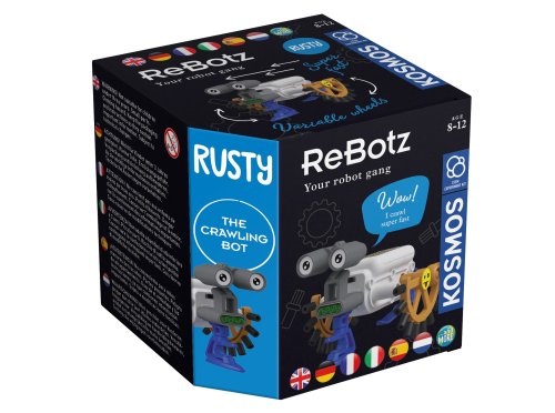 KOSMOS Robot Rusty jazdiaci. 3xAAA batérie nie sú súčasťou. Obsahuje dieliky na zloženie robota, nálepky. Odporúčaný vek 8-12 rokov. Slovenský návod na stiahnutie v digitálnej podobe-QR kód na krabici av návode.