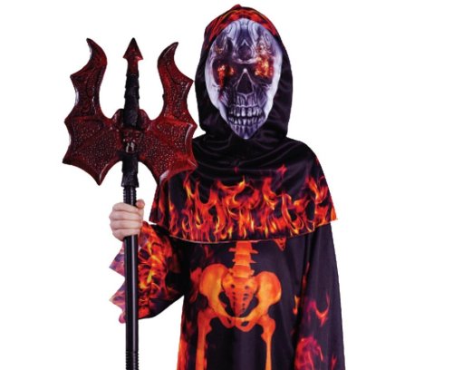 Kostým Diabol s kapucňou pre chlapcov vo veľkosti 130/140 cm predstavuje výrazný karnevalový outfit vhodný pre detské maškarné alebo tematické párty. Tento kostým pozostáva z dlhého plášťa s kapucňou, ktorý je vyrobený z ľahkého materiálu s čiernym podkladom, na ktorom je realisticky vyobrazený kostrový motív obklopený plameňmi. Plášť má nepravidelne strihaný spodný lem aj rukávy, čo umocňuje efekt horiaceho diabla.