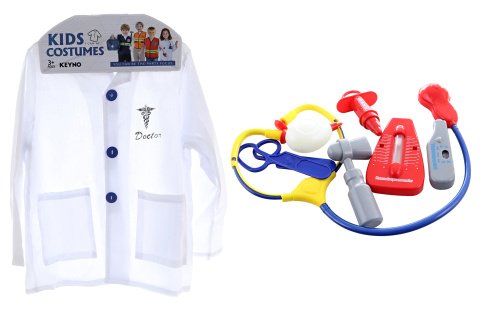 Doktorandský kostým. Balenie obsahuje plášť a sadu potrebných pomôcok pre malého doktora. Rozmery plášťa cca 51x39 cm, dĺžka rukáva od ramena 40 cm. Materiál polyester + plast. Balené v sáčku. Rozmery balenia cca 37x57x3 cm. Vek 3+