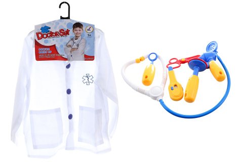 Kostým doktorka. Balenie obshauje plášť, rúšku a sústu pomôcok potrebných pre malú doktorku. Rozmery plášťa cca 40x54 cm, dĺžka rukáva od ramena cca 42 cm. Materiál polyester + plast. Balené v sáčku. Rozmery balenia cca 36x51x4 cm. Vek 3+