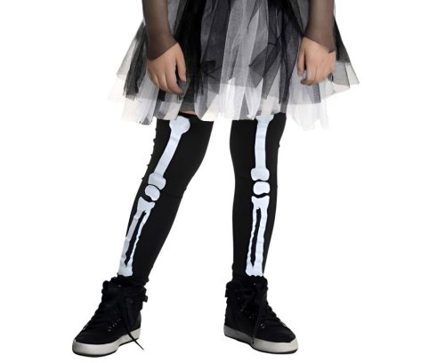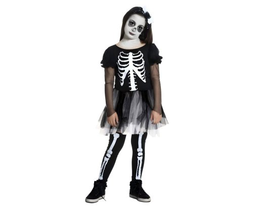 Spodná časť šiat je tvorená niekoľkými vrstvami čierneho a bieleho tylu, ktoré vytvárajú objemnú sukňu s efektom ľahkého splývania a kontrastu farieb. Tento dizajn pôsobí hravo a zároveň jemne strašidelne, čo je ideálne pre detský karnevalový kostým. Kostým na obrázku je doplnený o čierne legíny s bielym natlačeným motívom kostry, ktoré pokračujú tematiku kostlivca aj na nohách, hoci legíny nie sú súčasťou balenia.