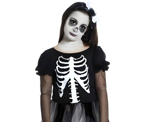 Celkový vzhľad kostýmu podčiarkuje jednoduchý, ale výrazný štýl, ktorý je vhodný pre malé deti vďaka pohodlnému strihu a pružnému materiálu. Kostým sa dá ľahko doplniť ďalšími doplnkami, napríklad líčením, ktoré zvýraznia kostlivcovský efekt, ako je vidieť na modelke na fotografiách. Tento detský kostým je výbornou voľbou pre karneval, halloween či iné tematické párty, kde deti chcú vyzerať originálne a zároveň pohodlne.