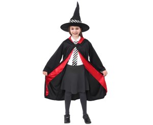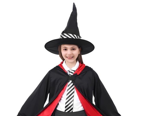 Detský kostým Kúzelník/Kúzelníčka, veľkosť 130/140 cm. Kostým obsahuje kúzelnícky klobúk a kúzelnícky plášť.