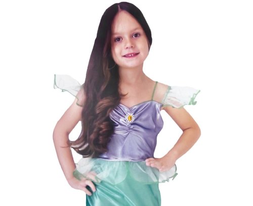 Kostým Morská víla zelený vo veľkosti 130/140 cm je navrhnutý pre deti, ktoré si želajú premeniť sa na rozprávkovú morskú vílu. Tento kostým tvorí elegantné šaty, ktoré dokonale napodobňujú vzhľad morskej panny. Horná časť šiat je vyrobená z lesklého fialového materiálu, ktorý pôsobí jemne a lesknúcim dojmom, a je doplnená priehľadnými zelenými ramienkami a volánikmi na ramenách, ktoré dodávajú kostýmu ľahkosť a vzdušnosť.