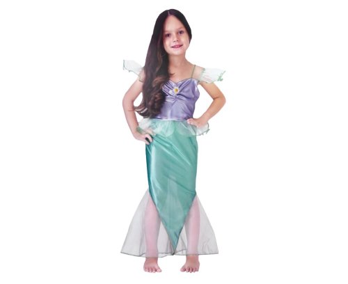 Spodná časť šiat je tvorená zeleným materiálom, ktorý simuluje morský chvost, pričom spodný lem je zakončený priehľadnou látkou v tvare plutvy, čo celému kostýmu dodáva autentickosť a rozprávkový nádych. Kostým je pohodlný na nosenie, pričom materiál je ľahký a vhodný na rôzne detské aktivity počas karnevalu alebo tematických osláv.
