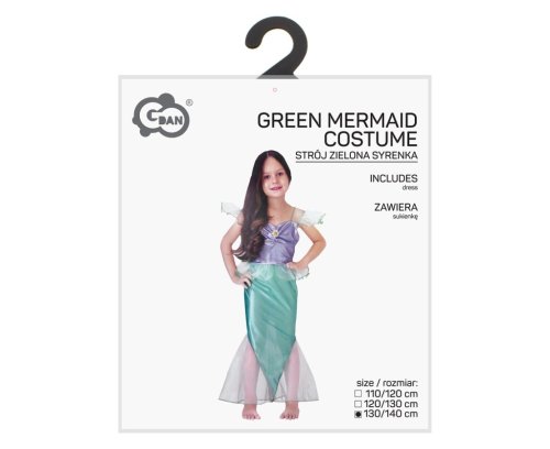 Celý kostým je balený na zavesenie s jasnou a prehľadnou etiketou, ktorá obsahuje informáciu o veľkostiach dostupných od 110/120 cm až po 130/140 cm, čo uľahčuje výber správnej veľkosti. Tento kostým je zaradený do kategórie karnevalových kostýmov a je ideálnou voľbou pre deti, ktoré chcú na párty alebo karneval zaujať originálnym a farebným prevlekom morskej víly.