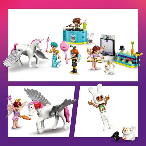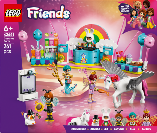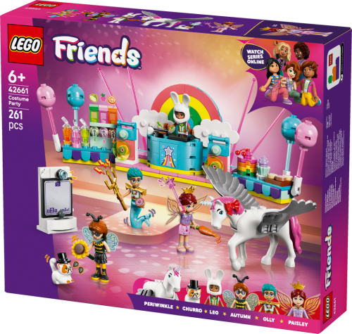 Stavebnica LEGO® Friends (42661) Kostýmová párty s jednorožcom a vílou pre dievčatá a chlapcov od 6 rokov obsahuje 4 minibábiky LEGO Friends, figúrku mačky a figúrku koňa a nechýba množstvo roztomilých párty doplnkov, ktoré inšpirujú k zábavnému hraniu. Deti si vymyslia vlastné zábavné príbehy a zahrajú si na spoločenské situácie s kamarátmi, ktorí si skúšajú kostýmy. Autumn je prezlečená za čmeliaka a Olly má kostým morského muža. Pripojí sa k nim aj kocúr Churro v kostýme kúzelníka a Leo v kostýme zajačika. Paisley má na sebe kostým víly a kôň Periwinkle sa premení v jednorožke. Kamaráti si užijú párty s pódiom, djským kútikom a občerstvením. Nechýba fotokútik so zábavnými doplnkami, kde kamaráti nafotia zábavné fotky! Objavte ďalšie skvelé hračky a darčeky zo sveta LEGO Friends (predávajú sa samostatne). Táto stavebnica je kompatibilná s aplikáciou LEGO Builder, ktorá prináša intuitívne staviteľské dobrodružstvo. V nej môžu deti približovať a otáčať modely a sledovať svoj postup pri stavaní.