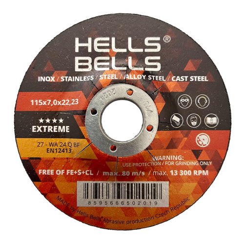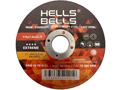 Brúsne kotúče Hells Bells s bakelitovým spojivom sú vyrobené z prémiového korundového zrna, ktoré je zárukou agresívneho brúsu a dlhej životnosti. Neobsahujú stopy železa, chlóru a síry. Sú určené na brúsenie uhlíkových ocelí, konštrukčných ocelí a nerezových ocelí.