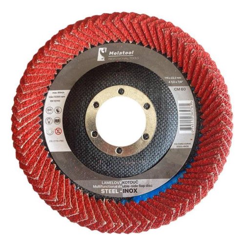 • brúsny kotúč so špičkovým samoostriacim keramickým brusivom, kde lamely sú na všetkých pracovných plochách (spodné, čelné a horné) kotúče a tvarovo sú prispôsobené na brúsenie štandardne i ťažko dostupných zvarových plôch akýchkoľvek zvarkov ako aj všetkých typov obrobiteľných materiálov, bežnej ocele a ocele vyšší , legovaná oceľ, nerezovaných ocelí, tvrdých materiálov, zváracích materiálov atď.