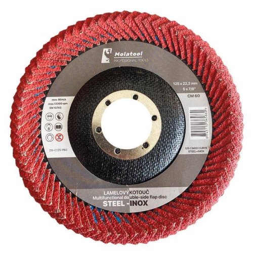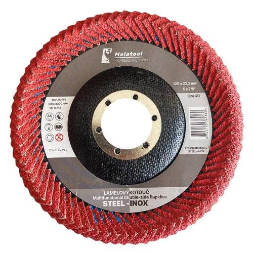 • brúsny kotúč so špičkovým samoostriacim keramickým brusivom, kde lamely sú na všetkých pracovných plochách (spodné, čelné a horné) kotúče a tvarovo sú prispôsobené na brúsenie štandardne i ťažko dostupných zvarových plôch akýchkoľvek zvarkov ako aj všetkých typov obrobiteľných materiálov, bežnej ocele a ocele vyšší , legovaná oceľ, nerezovaných ocelí, tvrdých materiálov, zváracích materiálov atď.
