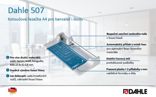 Rezačka pre malú kanceláriu Ostrý kotúčový a spodný nôž - kotúčový nôž v uzavretom puzdre Kapacita 8 listov (papier 70 g/m2) Výška rezu 0,8 mm; dĺžka rezu max. 320 mm Automatický prítlak v mieste rezu; …