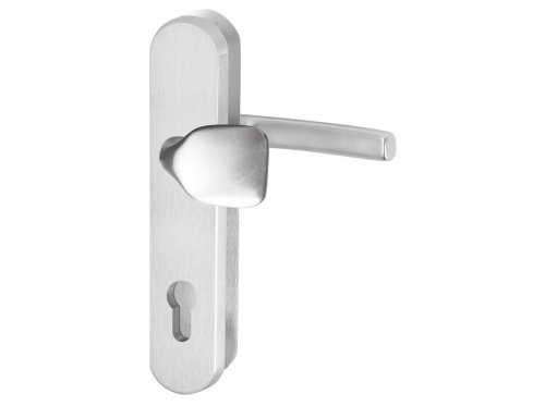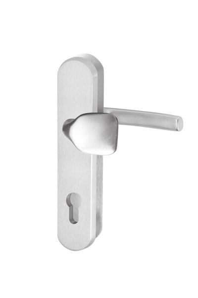 Hliníkové bezpečnostné kovanie - madlo / kľučka bez prekrytia vložky. Certifikované v bezpečnostnej triede RC3 podľa STN EN 1627:2012. Certifikát NBÚ typ 2 SS4=2. Masívne hliníkové bezpečnostné kovanie v povrchovej úprave F1 – strieborný elox. PZ - bez prekrytia vložky rozetú.
