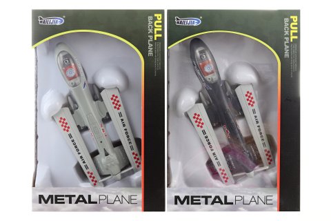 Kovové lietadlo na spätný chod. Napájanie na batérie 3xAG13, ktoré sú súčasťou balenia. Lietadlo po stlačení kolies vydáva zvuky letu a bliká. Balené v krabici. Rozmery balenia cca 18x27,5x6 cm. Veľkosť lietadla cca 22x9 cm. Vek 3+