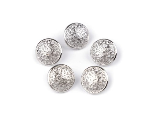 Kovové gombíky zdobia filigránový vzor. Sú vyrobené zo zliatiny zinku a nemagnetických kovov. Majú spodné prišívanie. Gombíky podčiarknu eleganciu kabátov, sák, košieľ a pod. Vyniknú tiež na doplnkoch ako sú kabelky, tašky alebo klobúky. [Gombíky sú balené vo vrecku .]Veľkosť gombíkov nájdete v tejto tabuľke. [Zinok chráni kov proti korózii. Pozinkované výrobky po vypraní zostávajú bezo zmien.]