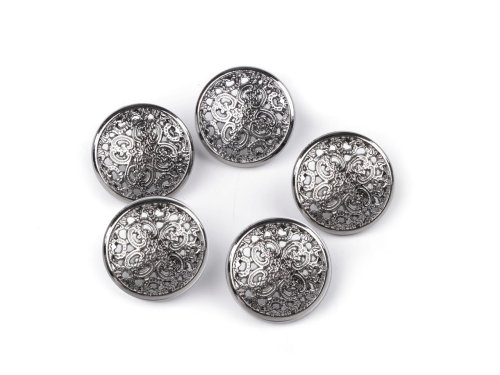 Kovové gombíky zdobia filigránový vzor. Sú vyrobené zo zliatiny zinku a nemagnetických kovov. Majú spodné prišívanie. Gombíky podčiarknu eleganciu kabátov, sák, košieľ a pod. Vyniknú tiež na doplnkoch ako sú kabelky, tašky alebo klobúky. [Gombíky sú balené vo vrecku .]Veľkosť gombíkov nájdete v tejto tabuľke. [Zinok chráni kov proti korózii. Pozinkované výrobky po vypraní zostávajú bezo zmien.]