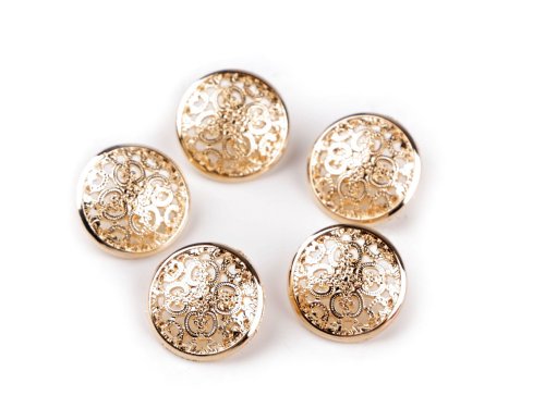 Kovové gombíky zdobia filigránový vzor. Sú vyrobené zo zliatiny zinku a nemagnetických kovov. Majú spodné prišívanie. Gombíky podčiarknu eleganciu kabátov, sák, košieľ a pod. Vyniknú tiež na doplnkoch ako sú kabelky, tašky alebo klobúky. [Gombíky sú balené vo vrecku .]Veľkosť gombíkov nájdete v tejto tabuľke. [Zinok chráni kov proti korózii. Pozinkované výrobky po vypraní zostávajú bezo zmien.]