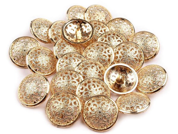 Kovové gombíky s filigránovým vzorom sú vyrobené zo zliatiny zinku a nemagnetických kovov. Majú spodné prišívanie. Gombíky elegantne vyniknú na kabátoch, sakách, košeliach a pod. Zaujímavo ozdobia aj kabelky, tašky alebo klobúky. [Gombíky sú balené vo vrecku .]Veľkosť gombíkov nájdete v tejto tabuľke. [Zinok chráni kov proti korózii. Pozinkované výrobky po vypraní zostávajú bezo zmien.]
